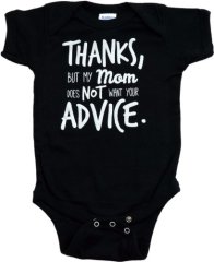 "This is a very cute onsie but the sizes run very small" - by Jessica Moro. Exceptionally super cute onesie for babies, with a not-so-subtle reminder that says "Thanks but my mom does not want your advice." When worn by your baby, these words...